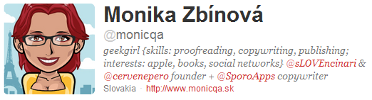 Monika Zbínová sa venuje jazykovej korektúre, copywritingu a vydávaniu kníh. Monik aje autorkou projektu červené pero a milujem slovenčinu. Pokiaľ sa o Monike a jej práci chcete dozvedieť viac tak navštívte jej web monicqa.sk. Na twitteri nájdede aj Červené pero, projekt Moniky Zbínovej. Červené pero sa venuje jazykovej korektúre, typografickej korektúre a korektúre beletire.